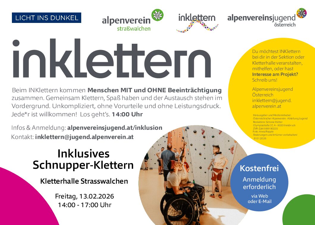 6. Februar 20266. Februar 2026Allgemein inklettern Beim INKlettern kommen Menschen MIT und OHNE Beeinträchtigungzusammen. Gemeinsam Klettern, Spaß haben und der Austausch stehen imVordergrund. Unkompliziert, ohne Vorurteile und ohne […]